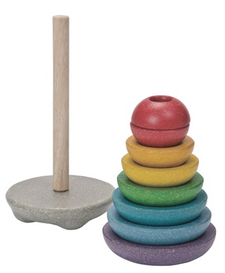 Instead, stacking rings (small enough for little fingers) with interesting textures, shape and color will be visually engaging, interesting to explore with fingers, mouth and feet (they will feel the edges, top, bottom, and explore the hole), allow stacking, banging, putting on and into (can put the rings in a wooden bowl or onto a wooden spoon handle), and provide opportunity for directed or interactive play with an adult or other child (that includes an action based conversation).